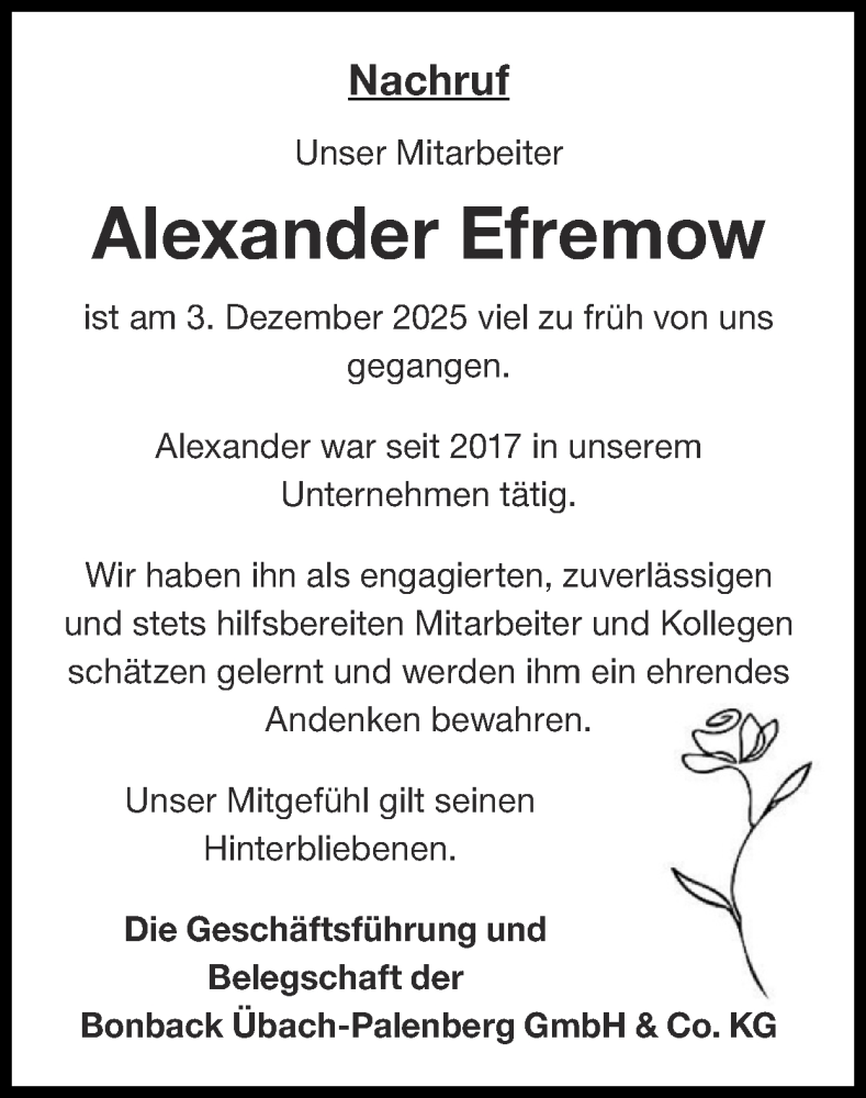 Hier finden Sie alle Traueranzeigen aus der Zeitung, die bisher für Alexander Efremow erschienen sind. Weitere Traueranzeigen, die in der Zeitung erscheinen, werden hier ebenfalls aufgelistet