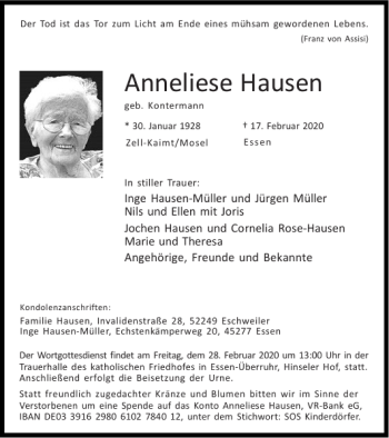 Hier finden Sie alle Traueranzeigen aus der Zeitung, die bisher für Anneliese Hausen erschienen sind. Weitere Traueranzeigen, die in der Zeitung erscheinen, werden hier ebenfalls aufgelistet