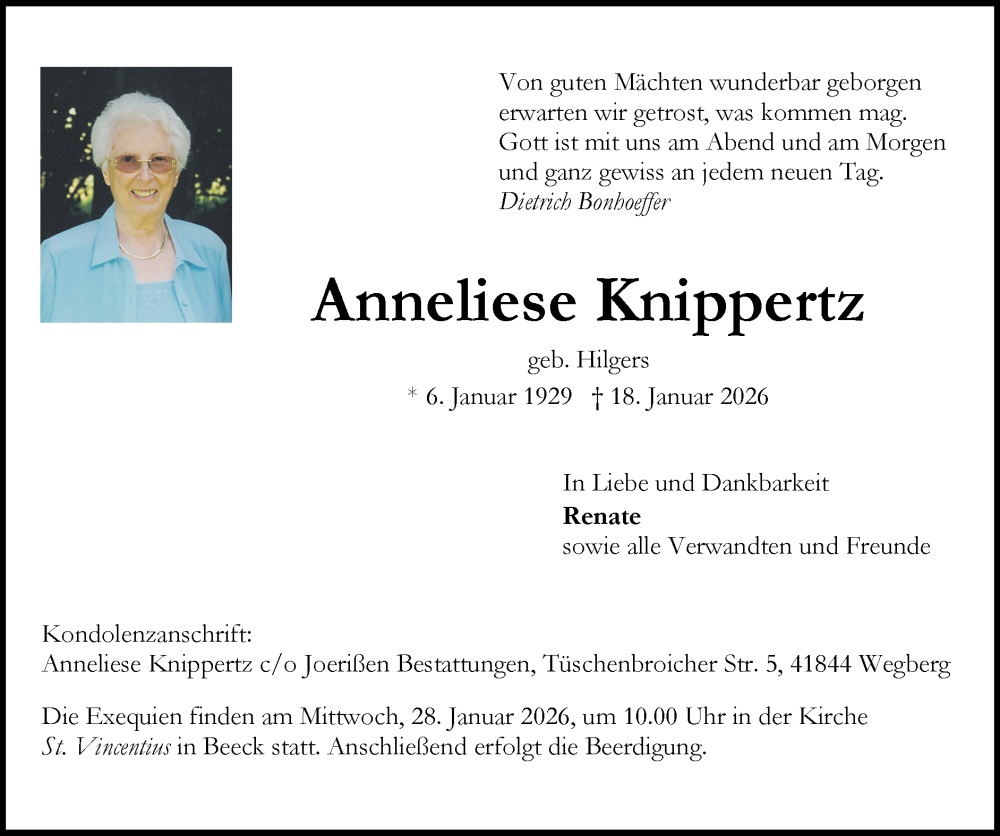 Hier finden Sie alle Traueranzeigen aus der Zeitung, die bisher für Anneliese Knippertz erschienen sind. Weitere Traueranzeigen, die in der Zeitung erscheinen, werden hier ebenfalls aufgelistet