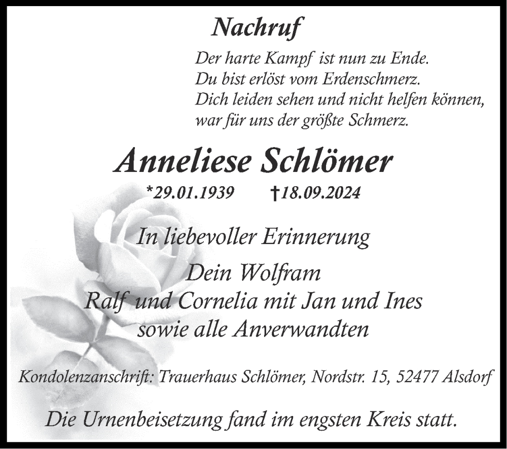 Hier finden Sie alle Traueranzeigen aus der Zeitung, die bisher für Anneliese Schlömer erschienen sind. Weitere Traueranzeigen, die in der Zeitung erscheinen, werden hier ebenfalls aufgelistet