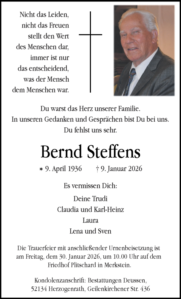 Hier finden Sie alle Traueranzeigen aus der Zeitung, die bisher für Bernd Steffens erschienen sind. Weitere Traueranzeigen, die in der Zeitung erscheinen, werden hier ebenfalls aufgelistet