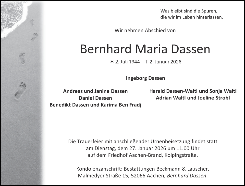 Hier finden Sie alle Traueranzeigen aus der Zeitung, die bisher für Bernhard Maria Dassen erschienen sind. Weitere Traueranzeigen, die in der Zeitung erscheinen, werden hier ebenfalls aufgelistet