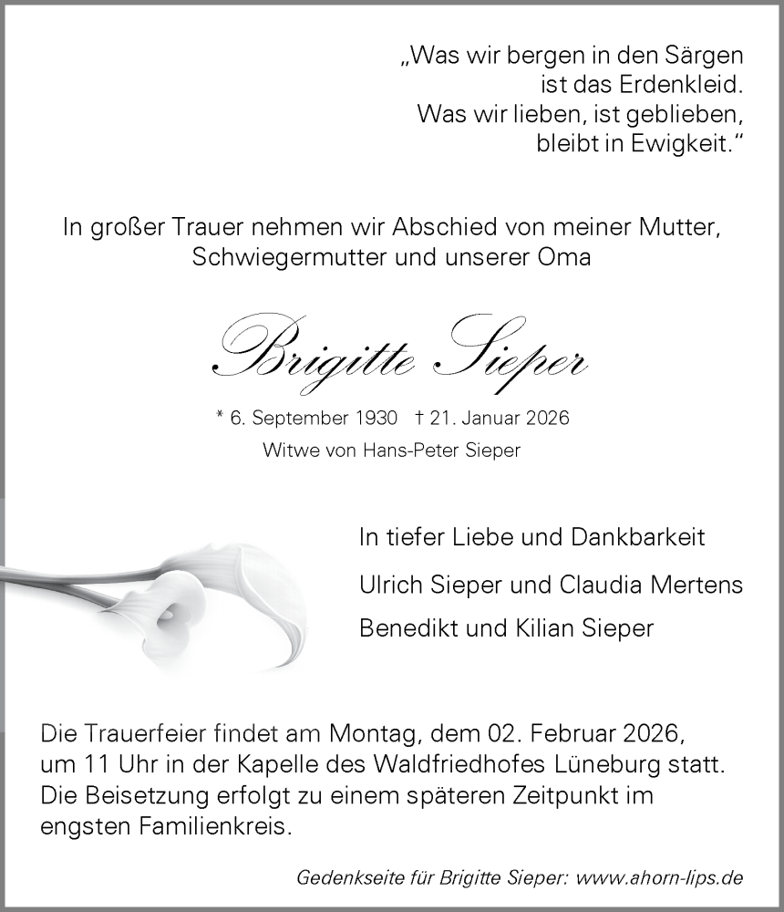 Hier finden Sie alle Traueranzeigen aus der Zeitung, die bisher für Brigitte Sieper erschienen sind. Weitere Traueranzeigen, die in der Zeitung erscheinen, werden hier ebenfalls aufgelistet