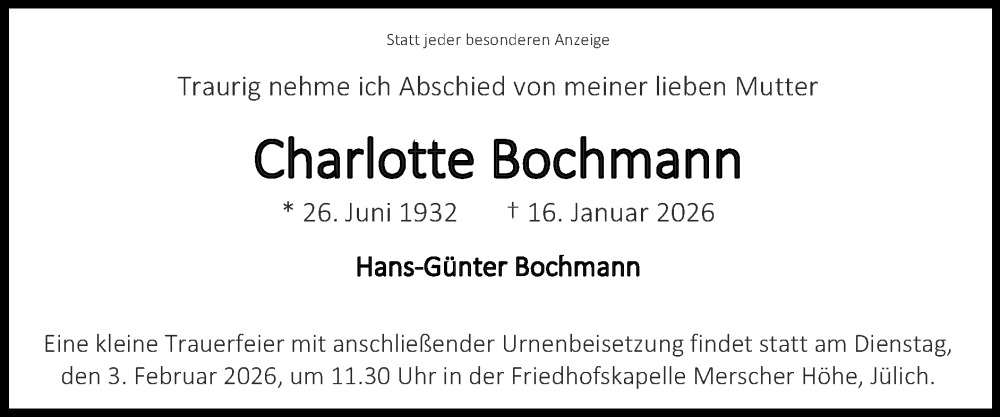 Hier finden Sie alle Traueranzeigen aus der Zeitung, die bisher für Charlotte Bochmann erschienen sind. Weitere Traueranzeigen, die in der Zeitung erscheinen, werden hier ebenfalls aufgelistet