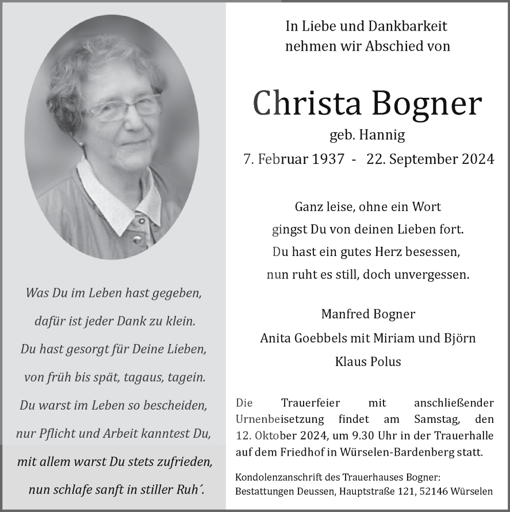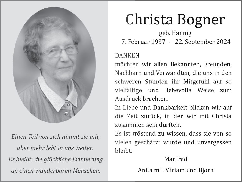 Hier finden Sie alle Traueranzeigen aus der Zeitung, die bisher für Christa Bogner erschienen sind. Weitere Traueranzeigen, die in der Zeitung erscheinen, werden hier ebenfalls aufgelistet