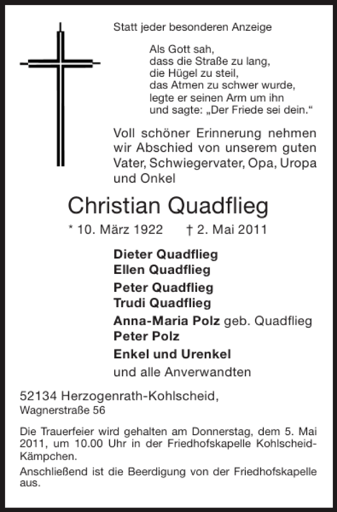 Hier finden Sie alle Traueranzeigen aus der Zeitung, die bisher für Christian Quadflieg erschienen sind. Weitere Traueranzeigen, die in der Zeitung erscheinen, werden hier ebenfalls aufgelistet