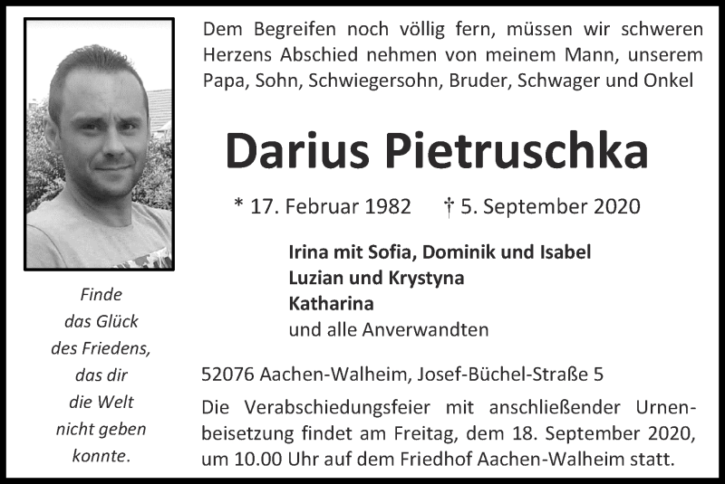 Hier finden Sie alle Traueranzeigen aus der Zeitung, die bisher für Darius Pietruschka erschienen sind. Weitere Traueranzeigen, die in der Zeitung erscheinen, werden hier ebenfalls aufgelistet