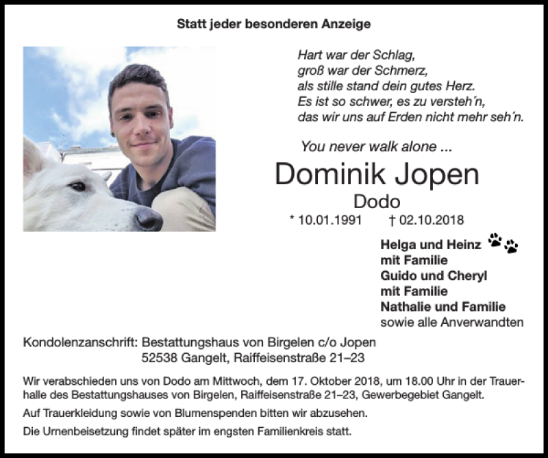 Hier finden Sie alle Traueranzeigen aus der Zeitung, die bisher für Dominik Jopen erschienen sind. Weitere Traueranzeigen, die in der Zeitung erscheinen, werden hier ebenfalls aufgelistet