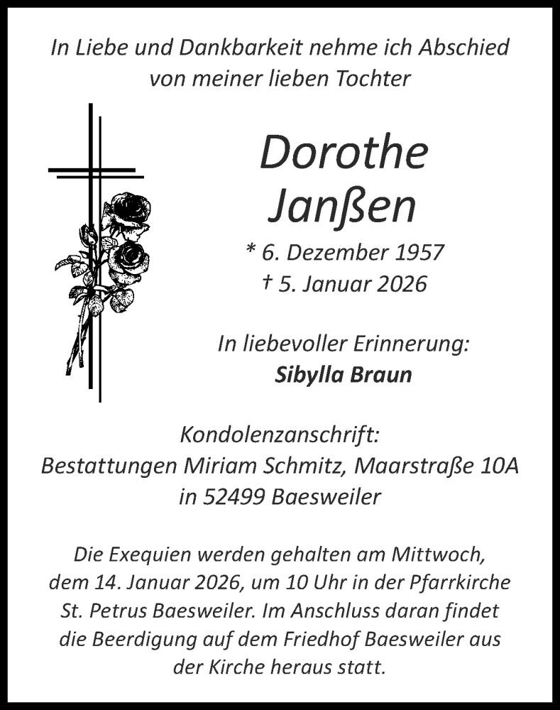 Hier finden Sie alle Traueranzeigen aus der Zeitung, die bisher für Dorothe Janßen erschienen sind. Weitere Traueranzeigen, die in der Zeitung erscheinen, werden hier ebenfalls aufgelistet