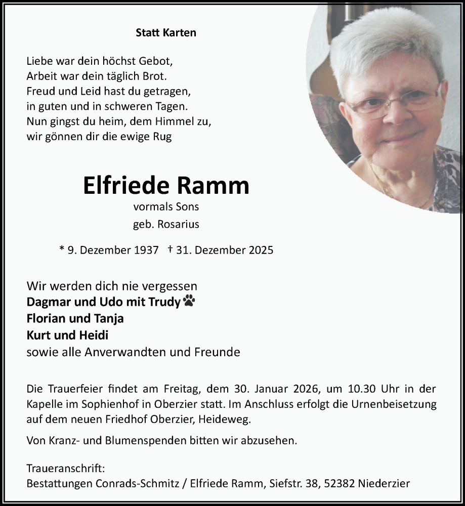 Hier finden Sie alle Traueranzeigen aus der Zeitung, die bisher für Elfriede Ramm erschienen sind. Weitere Traueranzeigen, die in der Zeitung erscheinen, werden hier ebenfalls aufgelistet