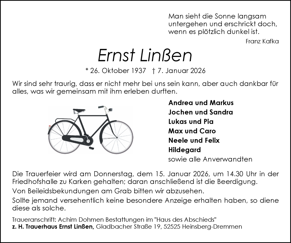 Hier finden Sie alle Traueranzeigen aus der Zeitung, die bisher für Ernst Linßen erschienen sind. Weitere Traueranzeigen, die in der Zeitung erscheinen, werden hier ebenfalls aufgelistet