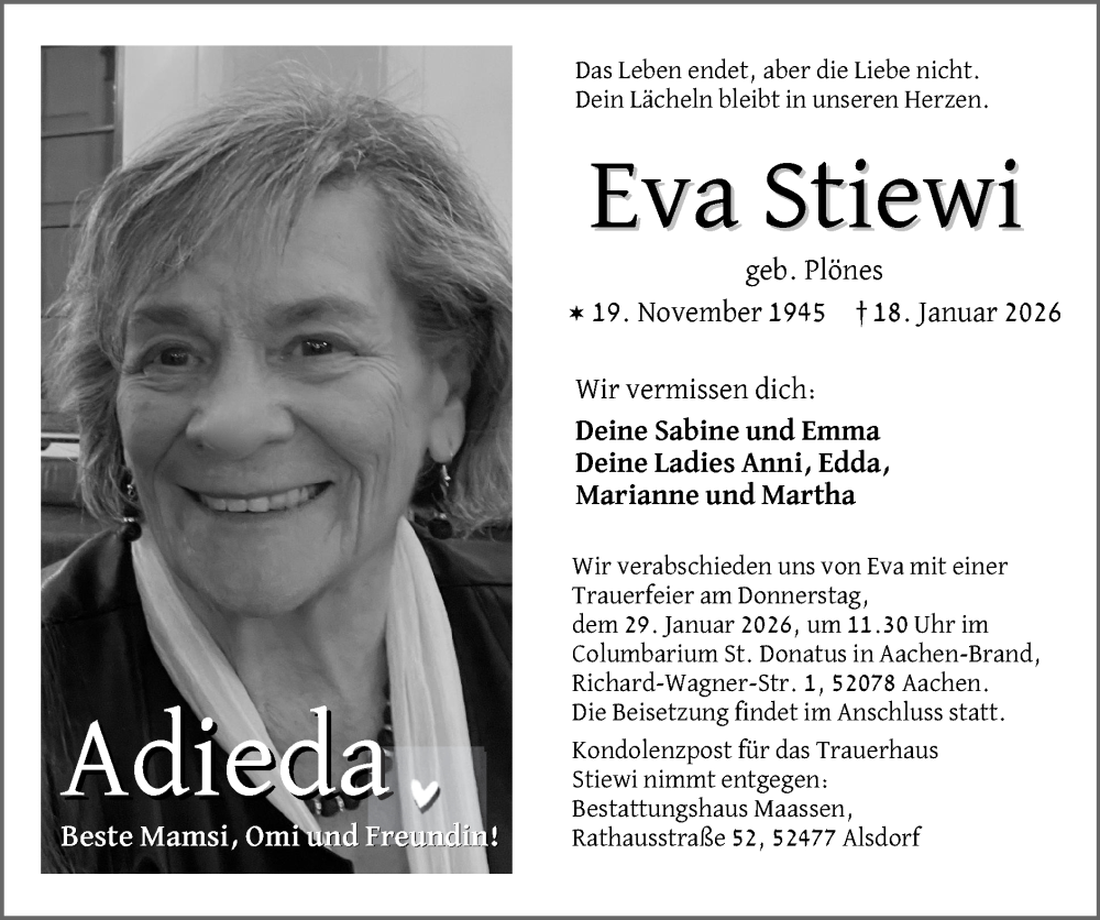 Hier finden Sie alle Traueranzeigen aus der Zeitung, die bisher für Eva Stiewi erschienen sind. Weitere Traueranzeigen, die in der Zeitung erscheinen, werden hier ebenfalls aufgelistet