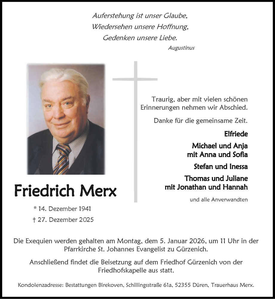 Hier finden Sie alle Traueranzeigen aus der Zeitung, die bisher für Friedrich Merx erschienen sind. Weitere Traueranzeigen, die in der Zeitung erscheinen, werden hier ebenfalls aufgelistet