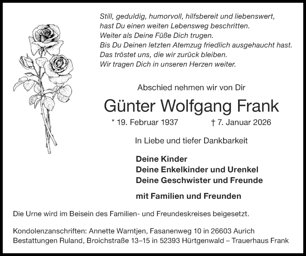 Hier finden Sie alle Traueranzeigen aus der Zeitung, die bisher für Günter Wolfgang Frank erschienen sind. Weitere Traueranzeigen, die in der Zeitung erscheinen, werden hier ebenfalls aufgelistet