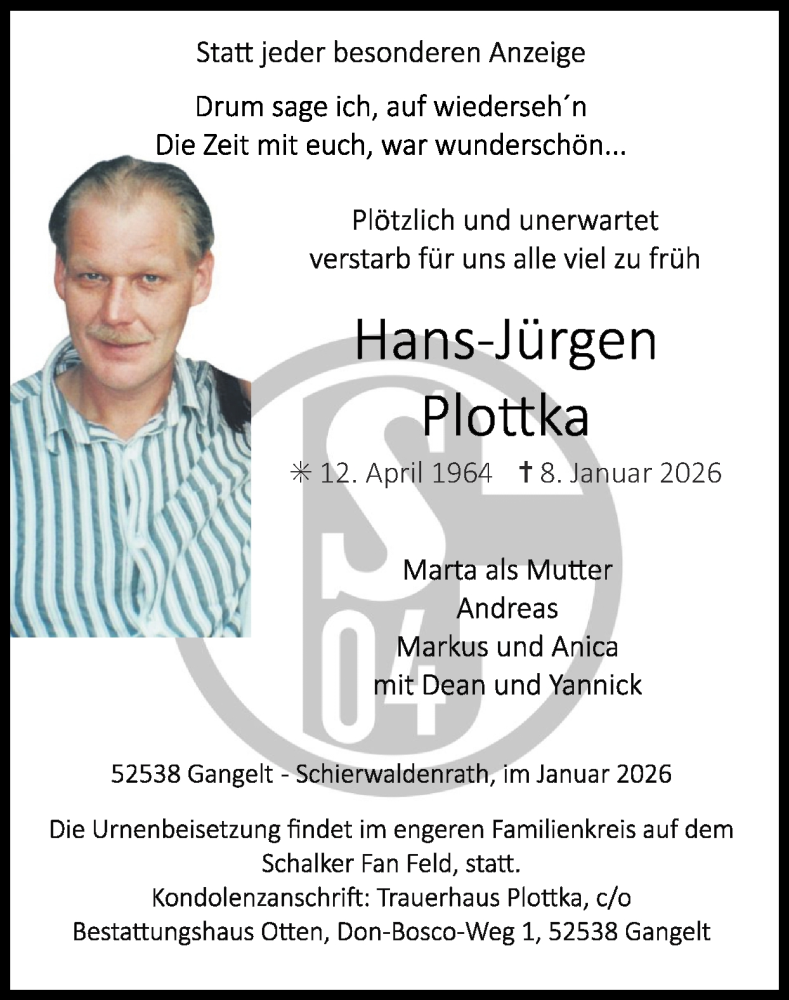 Hier finden Sie alle Traueranzeigen aus der Zeitung, die bisher für Hans-Jürgen Plottka erschienen sind. Weitere Traueranzeigen, die in der Zeitung erscheinen, werden hier ebenfalls aufgelistet