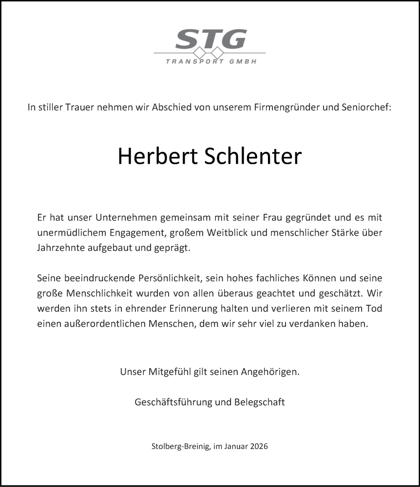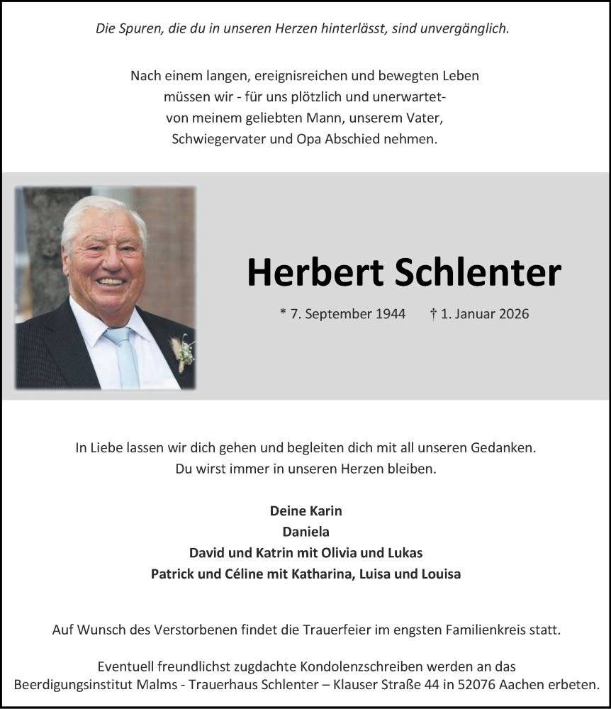 Hier finden Sie alle Traueranzeigen aus der Zeitung, die bisher für Herbert Schlenter erschienen sind. Weitere Traueranzeigen, die in der Zeitung erscheinen, werden hier ebenfalls aufgelistet