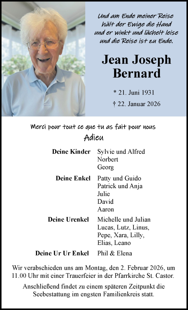 Hier finden Sie alle Traueranzeigen aus der Zeitung, die bisher für Jean Joseph Bernard erschienen sind. Weitere Traueranzeigen, die in der Zeitung erscheinen, werden hier ebenfalls aufgelistet