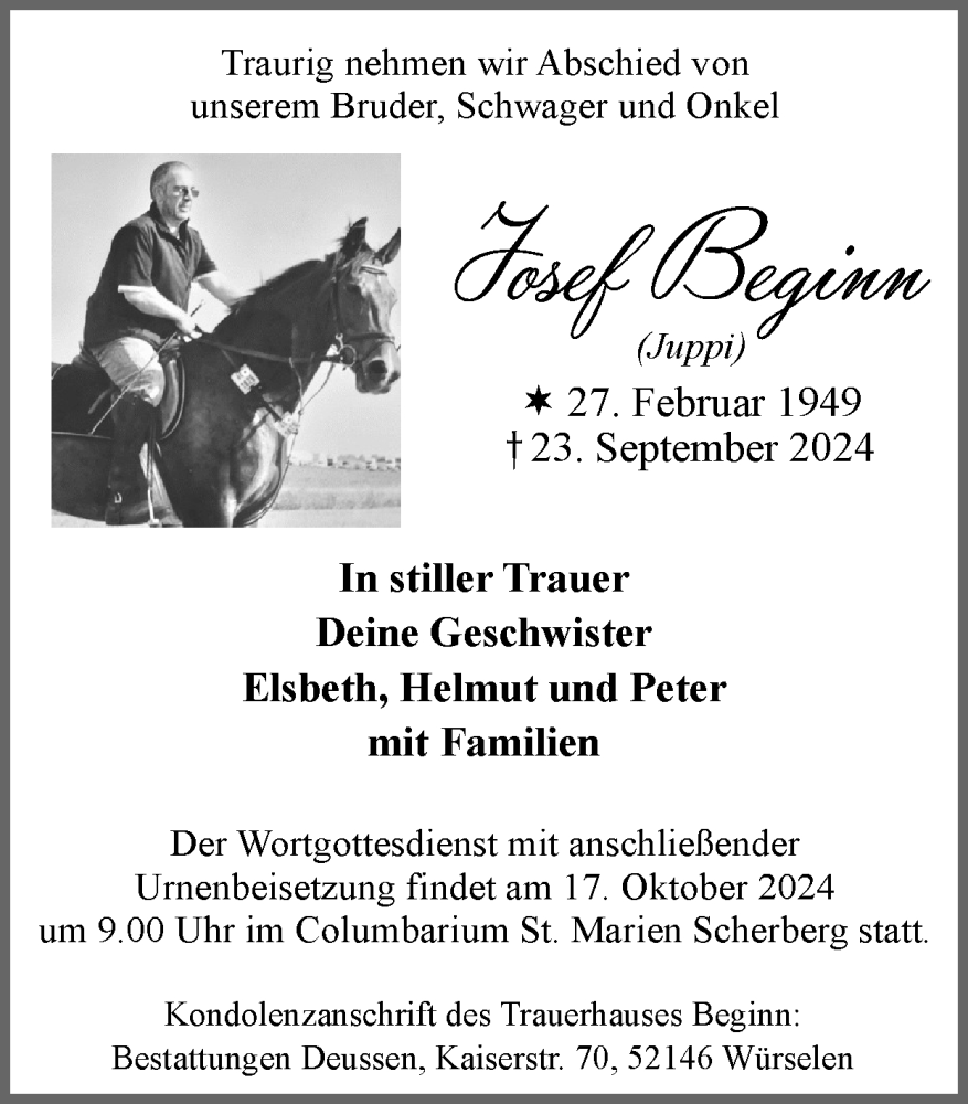 Hier finden Sie alle Traueranzeigen aus der Zeitung, die bisher für Josef Beginn erschienen sind. Weitere Traueranzeigen, die in der Zeitung erscheinen, werden hier ebenfalls aufgelistet