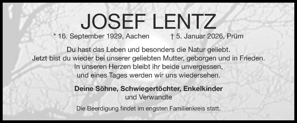 Hier finden Sie alle Traueranzeigen aus der Zeitung, die bisher für Josef Lentz erschienen sind. Weitere Traueranzeigen, die in der Zeitung erscheinen, werden hier ebenfalls aufgelistet
