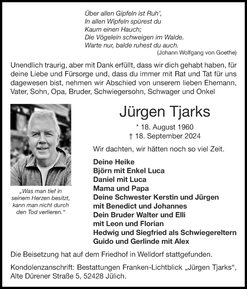 Hier finden Sie alle Traueranzeigen aus der Zeitung, die bisher für Jürgen Tjarks erschienen sind. Weitere Traueranzeigen, die in der Zeitung erscheinen, werden hier ebenfalls aufgelistet