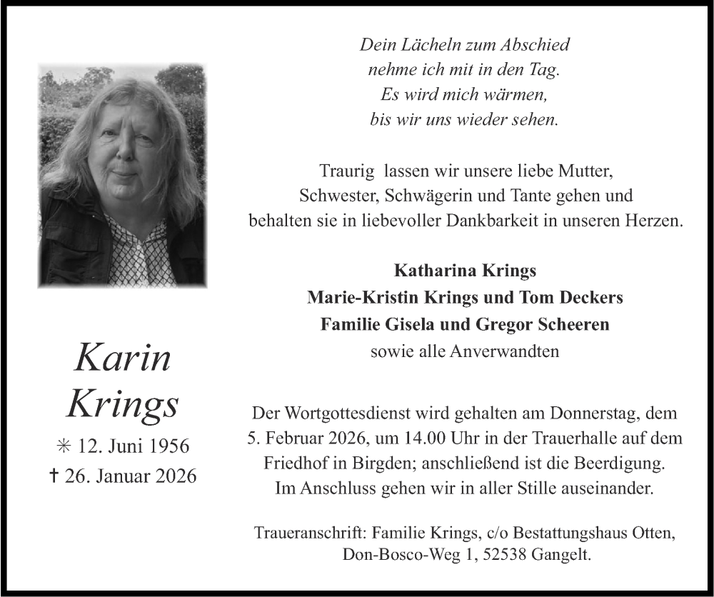 Hier finden Sie alle Traueranzeigen aus der Zeitung, die bisher für Karin Krings erschienen sind. Weitere Traueranzeigen, die in der Zeitung erscheinen, werden hier ebenfalls aufgelistet