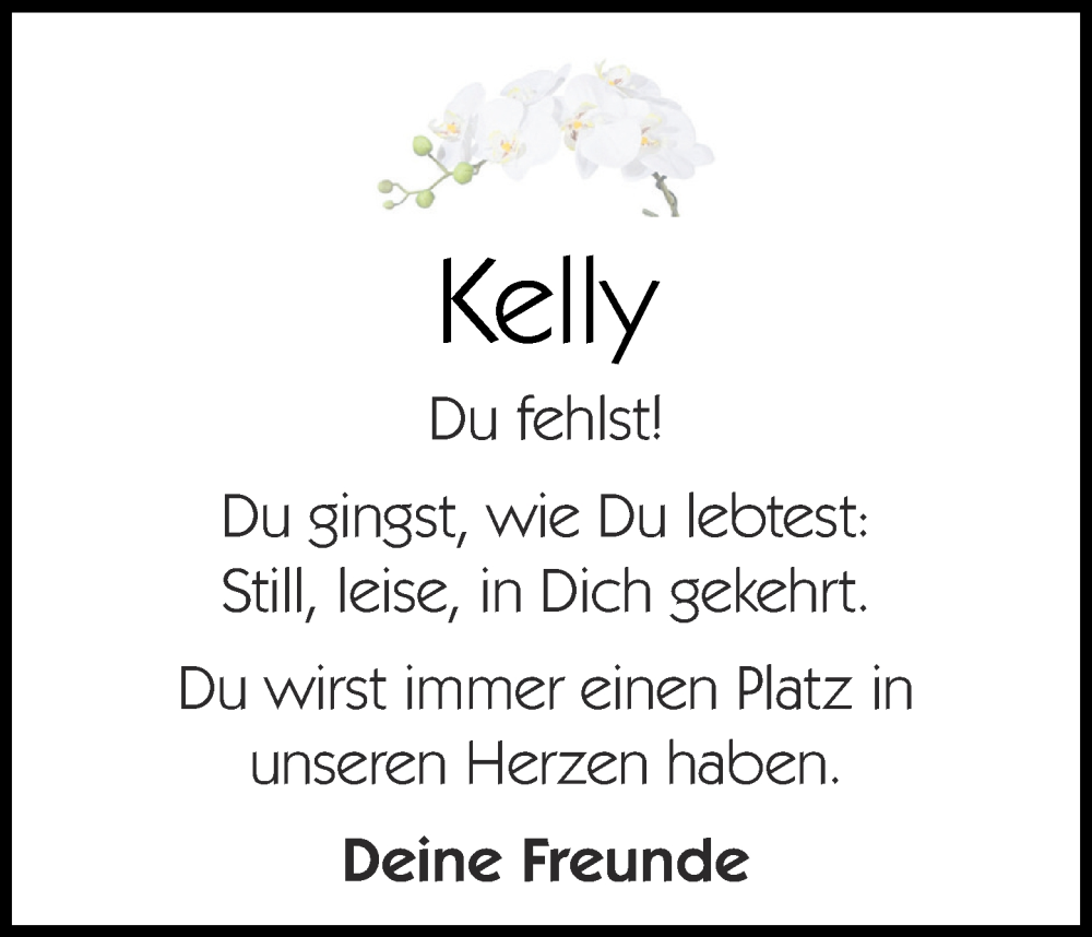 Hier finden Sie alle Traueranzeigen aus der Zeitung, die bisher für Kelly erschienen sind. Weitere Traueranzeigen, die in der Zeitung erscheinen, werden hier ebenfalls aufgelistet