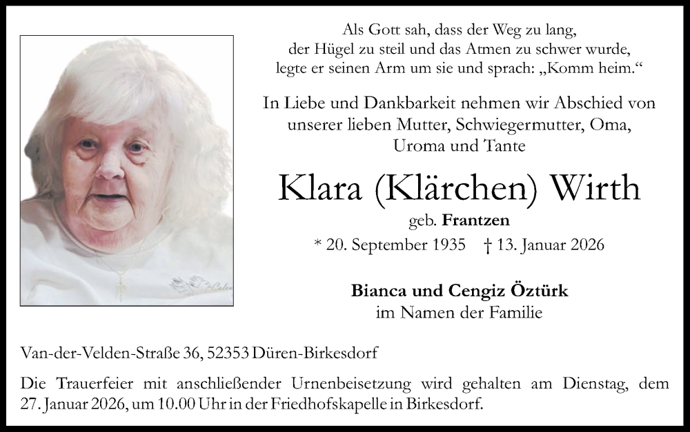 Hier finden Sie alle Traueranzeigen aus der Zeitung, die bisher für Klara Wirth erschienen sind. Weitere Traueranzeigen, die in der Zeitung erscheinen, werden hier ebenfalls aufgelistet