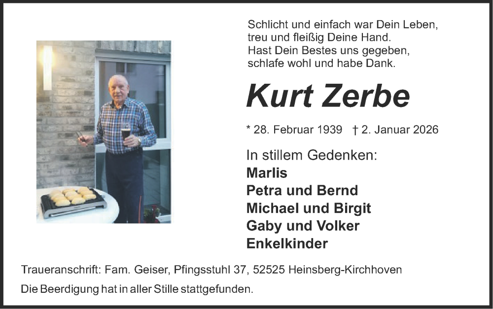 Hier finden Sie alle Traueranzeigen aus der Zeitung, die bisher für Kurt Zerbe erschienen sind. Weitere Traueranzeigen, die in der Zeitung erscheinen, werden hier ebenfalls aufgelistet