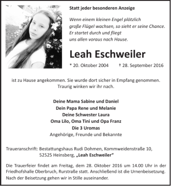 Hier finden Sie alle Traueranzeigen aus der Zeitung, die bisher für Leah Eschweiler erschienen sind. Weitere Traueranzeigen, die in der Zeitung erscheinen, werden hier ebenfalls aufgelistet