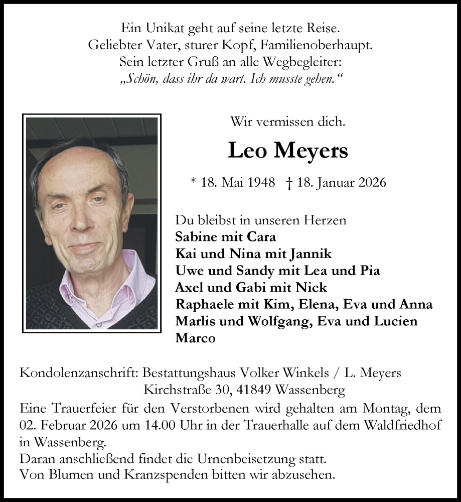 Hier finden Sie alle Traueranzeigen aus der Zeitung, die bisher für Leo Meyers erschienen sind. Weitere Traueranzeigen, die in der Zeitung erscheinen, werden hier ebenfalls aufgelistet