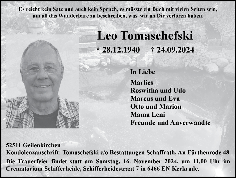 Hier finden Sie alle Traueranzeigen aus der Zeitung, die bisher für Leo Tomaschefski erschienen sind. Weitere Traueranzeigen, die in der Zeitung erscheinen, werden hier ebenfalls aufgelistet