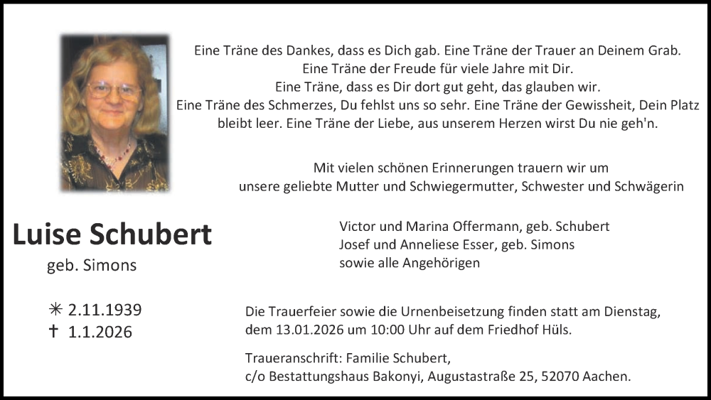 Hier finden Sie alle Traueranzeigen aus der Zeitung, die bisher für Luise Schubert erschienen sind. Weitere Traueranzeigen, die in der Zeitung erscheinen, werden hier ebenfalls aufgelistet