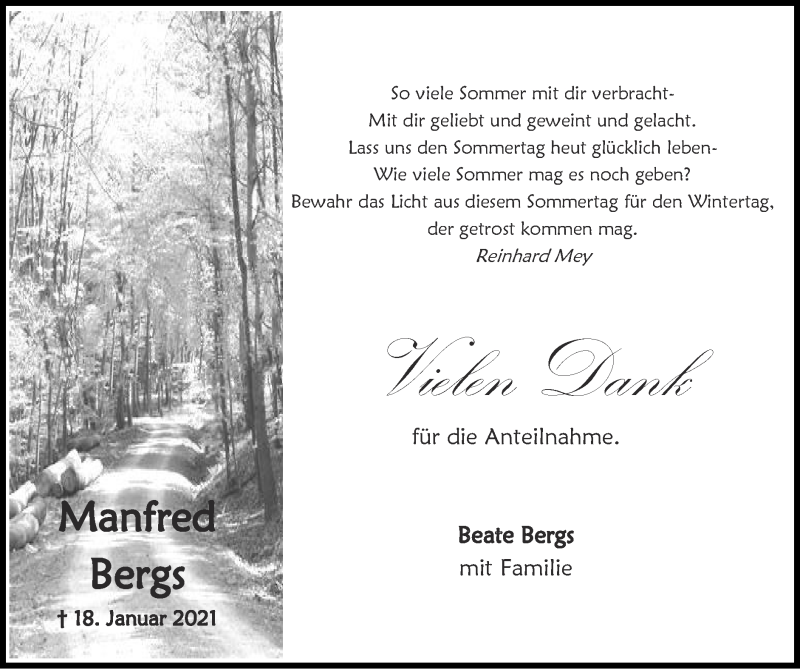 Hier finden Sie alle Traueranzeigen aus der Zeitung, die bisher für Manfred Bergs erschienen sind. Weitere Traueranzeigen, die in der Zeitung erscheinen, werden hier ebenfalls aufgelistet