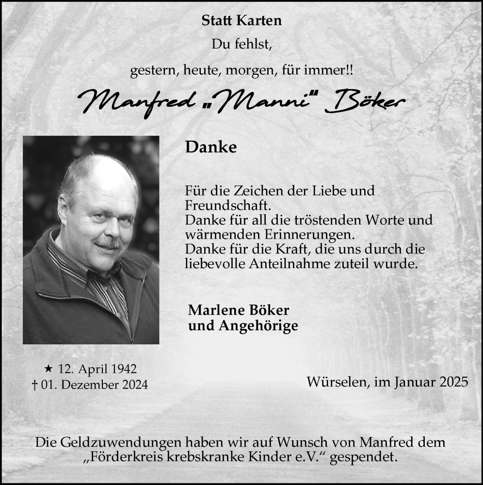 Hier finden Sie alle Traueranzeigen aus der Zeitung, die bisher für Manfred Böker erschienen sind. Weitere Traueranzeigen, die in der Zeitung erscheinen, werden hier ebenfalls aufgelistet