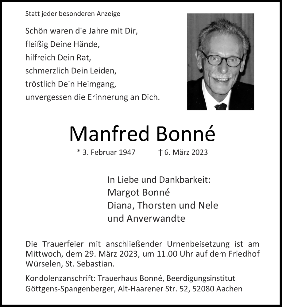 Hier finden Sie alle Traueranzeigen aus der Zeitung, die bisher für Manfred Bonné erschienen sind. Weitere Traueranzeigen, die in der Zeitung erscheinen, werden hier ebenfalls aufgelistet