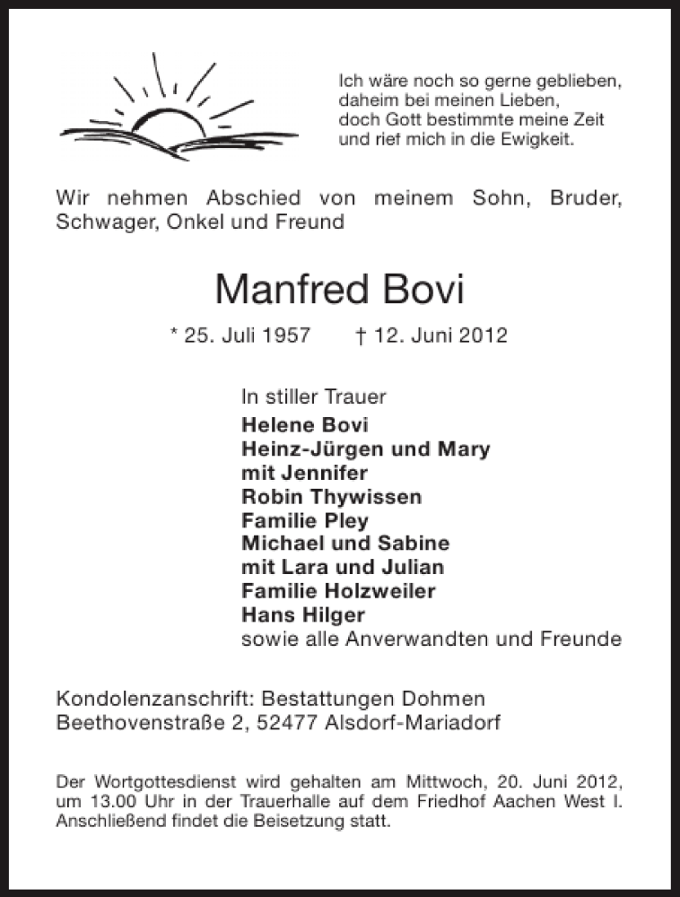 Hier finden Sie alle Traueranzeigen aus der Zeitung, die bisher für Manfred Bovi erschienen sind. Weitere Traueranzeigen, die in der Zeitung erscheinen, werden hier ebenfalls aufgelistet