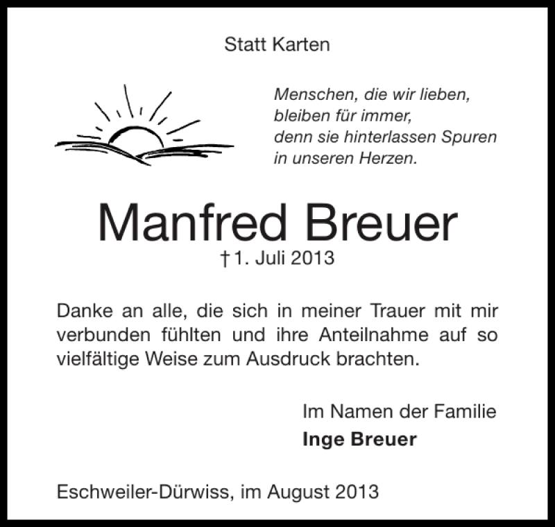 Hier finden Sie alle Traueranzeigen aus der Zeitung, die bisher für Manfred Breuer erschienen sind. Weitere Traueranzeigen, die in der Zeitung erscheinen, werden hier ebenfalls aufgelistet