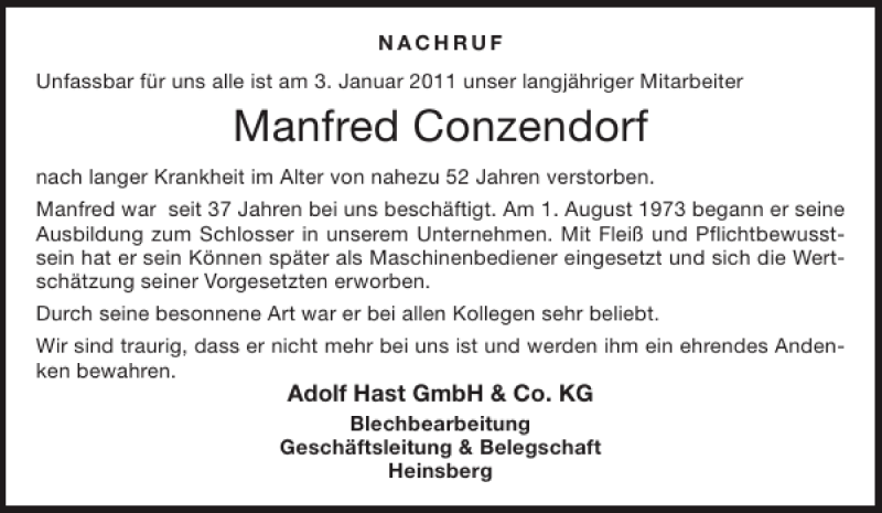 Hier finden Sie alle Traueranzeigen aus der Zeitung, die bisher für Manfred Conzendorf erschienen sind. Weitere Traueranzeigen, die in der Zeitung erscheinen, werden hier ebenfalls aufgelistet