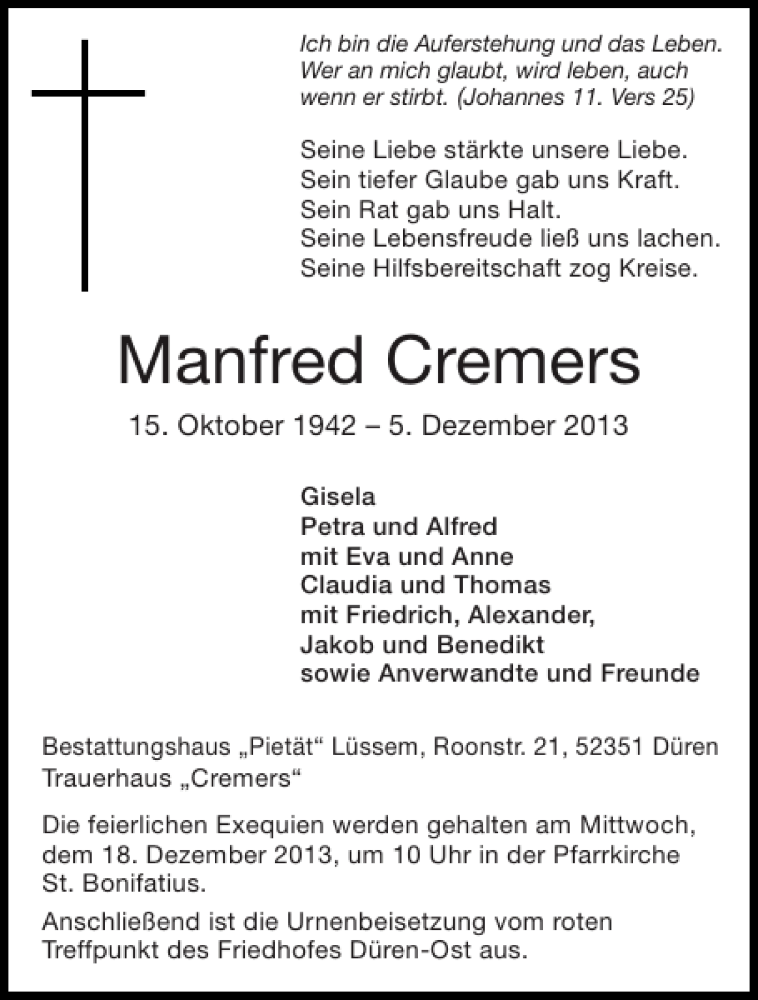 Hier finden Sie alle Traueranzeigen aus der Zeitung, die bisher für Manfred Cremers erschienen sind. Weitere Traueranzeigen, die in der Zeitung erscheinen, werden hier ebenfalls aufgelistet