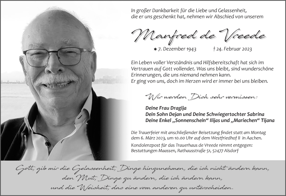 Hier finden Sie alle Traueranzeigen aus der Zeitung, die bisher für Manfred de Vreede erschienen sind. Weitere Traueranzeigen, die in der Zeitung erscheinen, werden hier ebenfalls aufgelistet