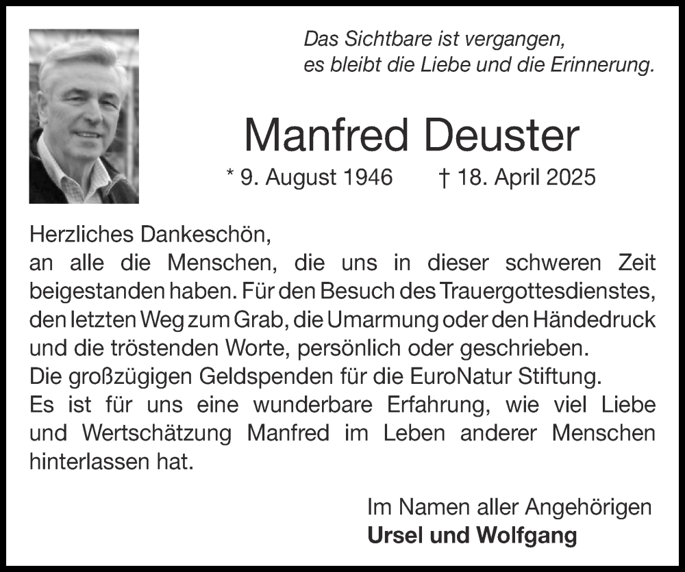 Hier finden Sie alle Traueranzeigen aus der Zeitung, die bisher für Manfred Deuster erschienen sind. Weitere Traueranzeigen, die in der Zeitung erscheinen, werden hier ebenfalls aufgelistet