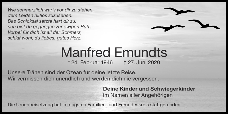 Hier finden Sie alle Traueranzeigen aus der Zeitung, die bisher für Manfred Emundts erschienen sind. Weitere Traueranzeigen, die in der Zeitung erscheinen, werden hier ebenfalls aufgelistet
