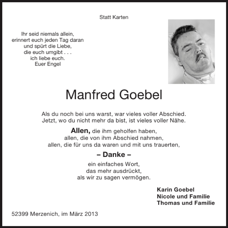 Hier finden Sie alle Traueranzeigen aus der Zeitung, die bisher für Manfred Goebel erschienen sind. Weitere Traueranzeigen, die in der Zeitung erscheinen, werden hier ebenfalls aufgelistet