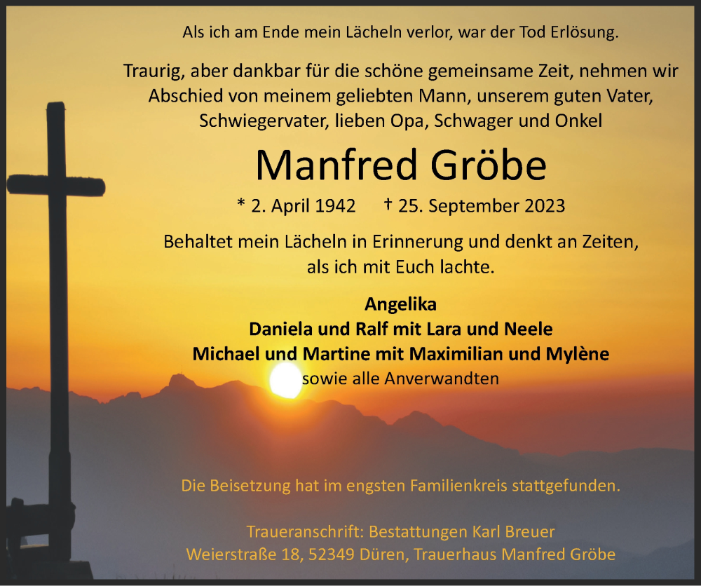 Hier finden Sie alle Traueranzeigen aus der Zeitung, die bisher für Manfred Gröbe erschienen sind. Weitere Traueranzeigen, die in der Zeitung erscheinen, werden hier ebenfalls aufgelistet