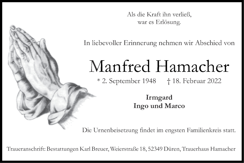 Hier finden Sie alle Traueranzeigen aus der Zeitung, die bisher für Manfred Hamacher erschienen sind. Weitere Traueranzeigen, die in der Zeitung erscheinen, werden hier ebenfalls aufgelistet