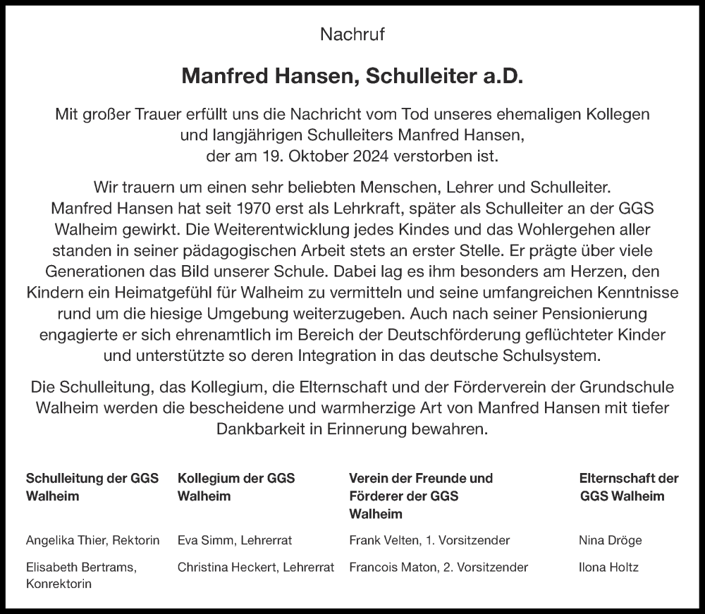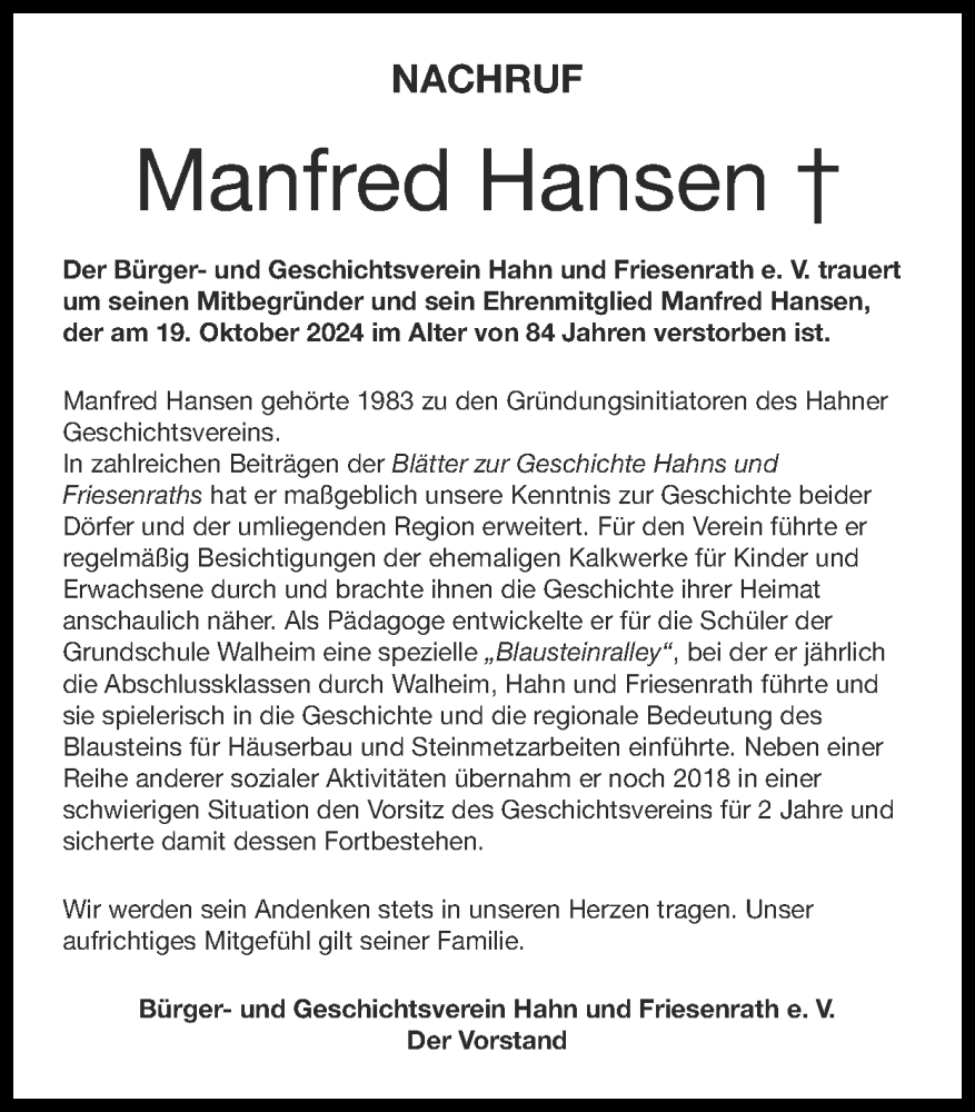 Hier finden Sie alle Traueranzeigen aus der Zeitung, die bisher für Manfred Hansen erschienen sind. Weitere Traueranzeigen, die in der Zeitung erscheinen, werden hier ebenfalls aufgelistet