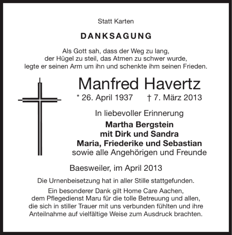 Hier finden Sie alle Traueranzeigen aus der Zeitung, die bisher für Manfred Havertz erschienen sind. Weitere Traueranzeigen, die in der Zeitung erscheinen, werden hier ebenfalls aufgelistet