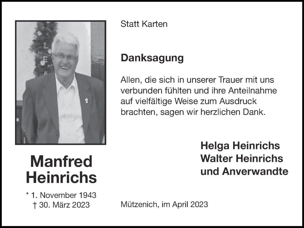 Hier finden Sie alle Traueranzeigen aus der Zeitung, die bisher für Manfred Heinrichs erschienen sind. Weitere Traueranzeigen, die in der Zeitung erscheinen, werden hier ebenfalls aufgelistet