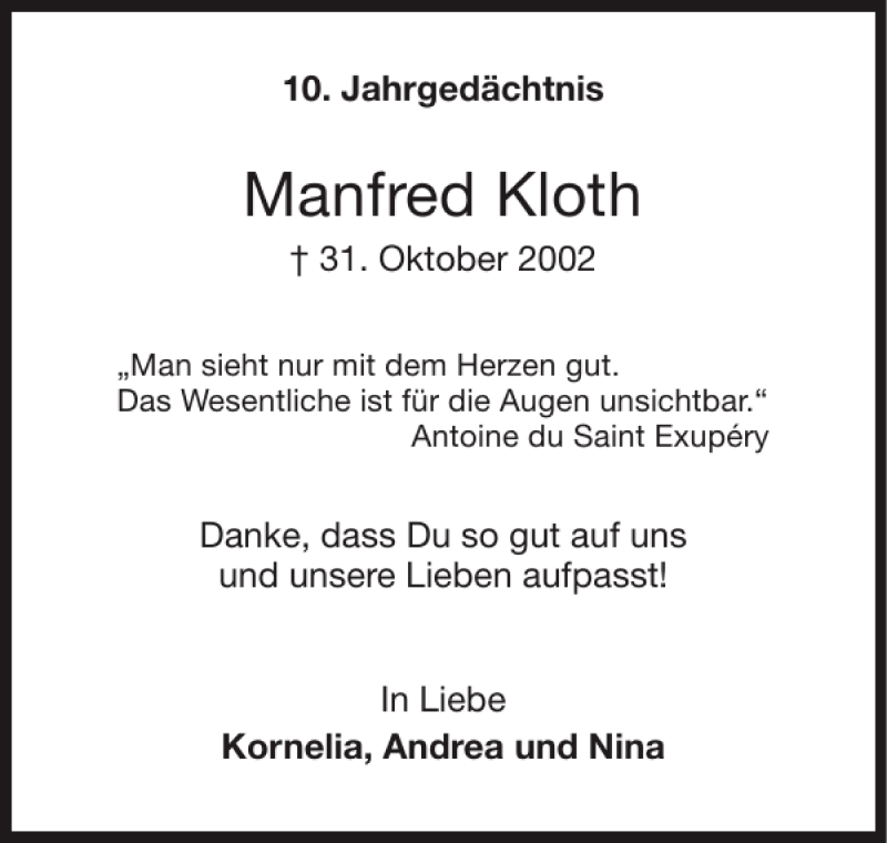 Hier finden Sie alle Traueranzeigen aus der Zeitung, die bisher für Manfred Kloth erschienen sind. Weitere Traueranzeigen, die in der Zeitung erscheinen, werden hier ebenfalls aufgelistet