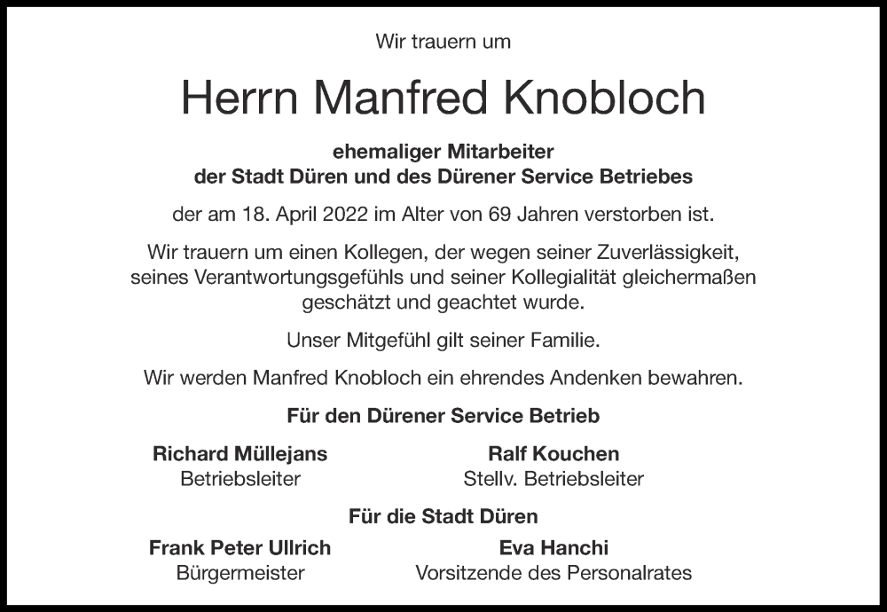 Hier finden Sie alle Traueranzeigen aus der Zeitung, die bisher für Manfred Knobloch erschienen sind. Weitere Traueranzeigen, die in der Zeitung erscheinen, werden hier ebenfalls aufgelistet